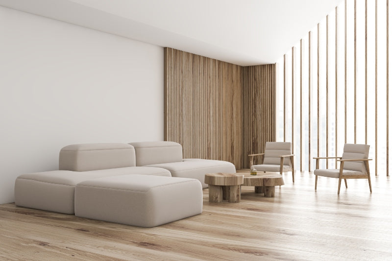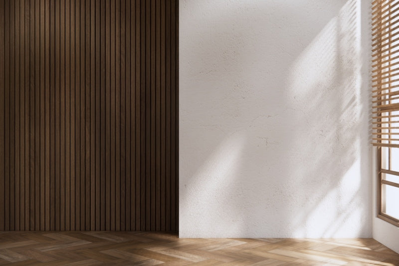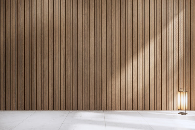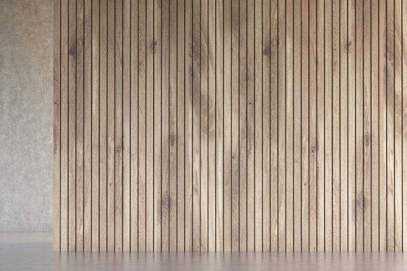 חיפוי קיר עץ בגמר טבעי עם חריצים עבים, עמוקים וסימטריים, ליצירת מראה מחורץ מודגש.