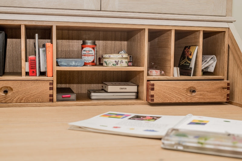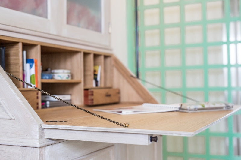 מכתבת אלון רחבה המשלבת פונקציונליות גבוהה עם אסתטיקה קלאסית. משטח העבודה נפתח מטה על שרשראות פליז, ומאחוריו מערכת תאים ומגירות בעבודת יד, המותאמת לפריטים אישיים ולמכשירי מדיה. בחלקה העליון ארונית סגורה לאחסון טלוויזיה. כל פרטי החיבורים – מהמגרעות ועד לצירי העץ הנסתרים – נעשו בגישה של נגרות מסורתית, ללא תוספות מיותרות.