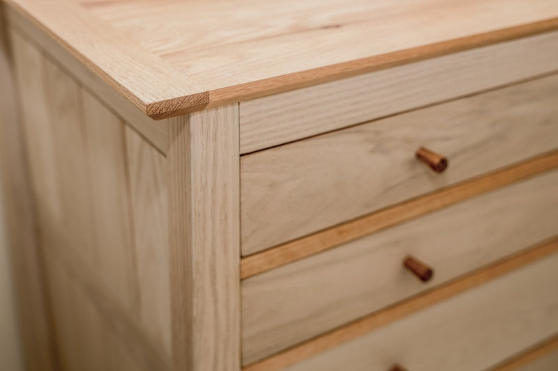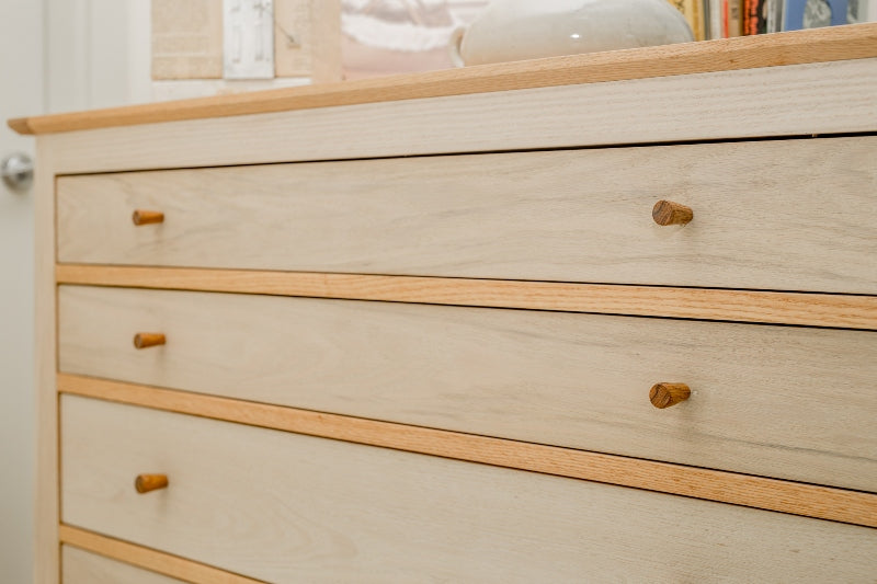 שידת ארבע מגירות בגימור אלון אמריקאי מולבן, עם ידיות עץ גולמי בעבודת יד וגימור שמבליט את הטקסטורה הטבעית של העץ. המגרעות בנויות במלאכת מחשבת המאפשרת פתיחה רכה ועמידות ארוכת שנים. היחידה נבנתה בגובה ומפתח מדויקים כדי להתאים לצרכי אחסון מגוונים, תוך שמירה על מראה נקי ועל גימור עדין שמתאים לחדר שינה או לפינת עבודה.