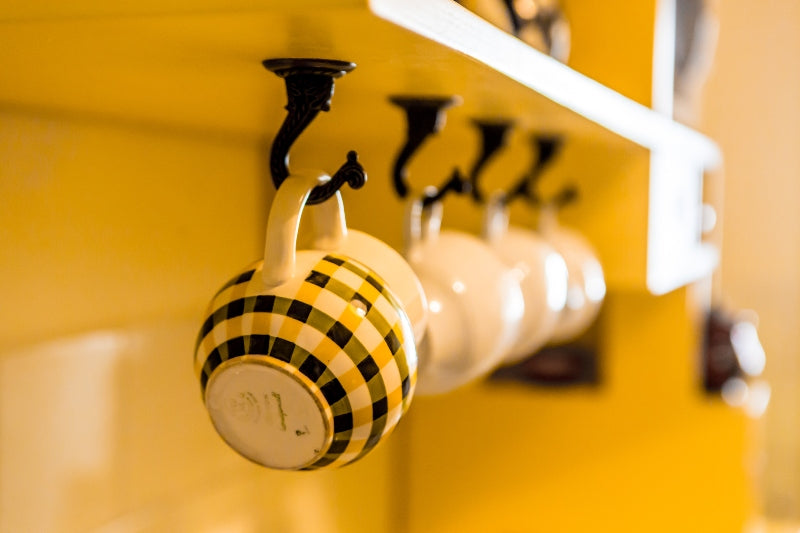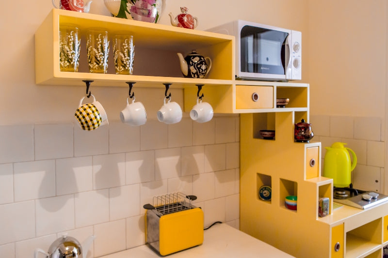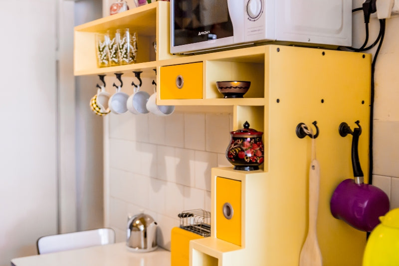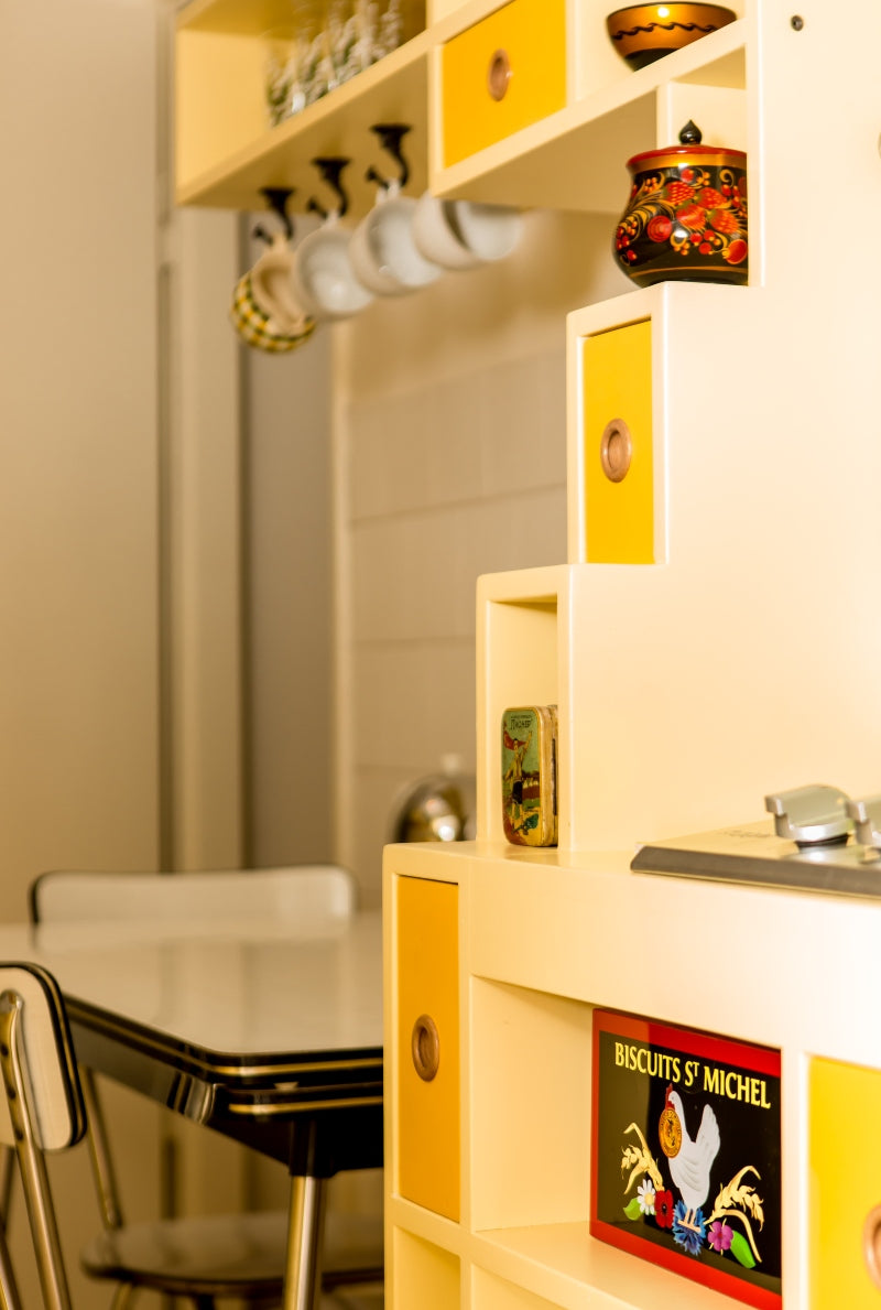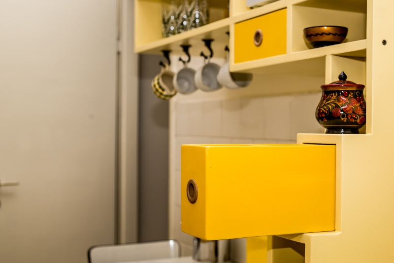הבחירה בגוון צהוב חמאה, יחד עם מגירות בגימור לימוני בוהק, הפכה את המטבחון למוקד מלא חיים – כזה שמאיר את הקיר גם בלי חלון.