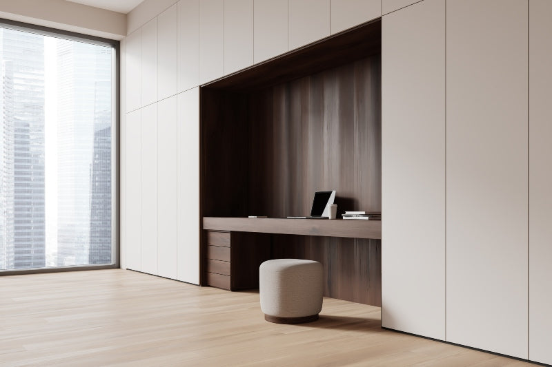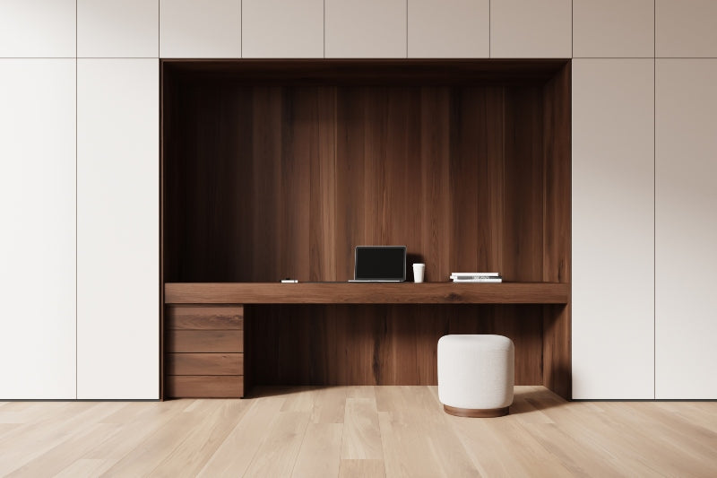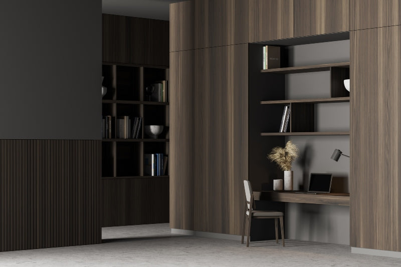 חיפויי קיר בגמר אגוז, שולחנות עבודה, ארונות אינטגרליים, נישות עבודה וקירות אחסון משולבים במדפים פתוחים.