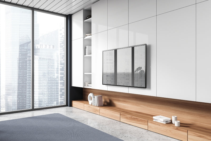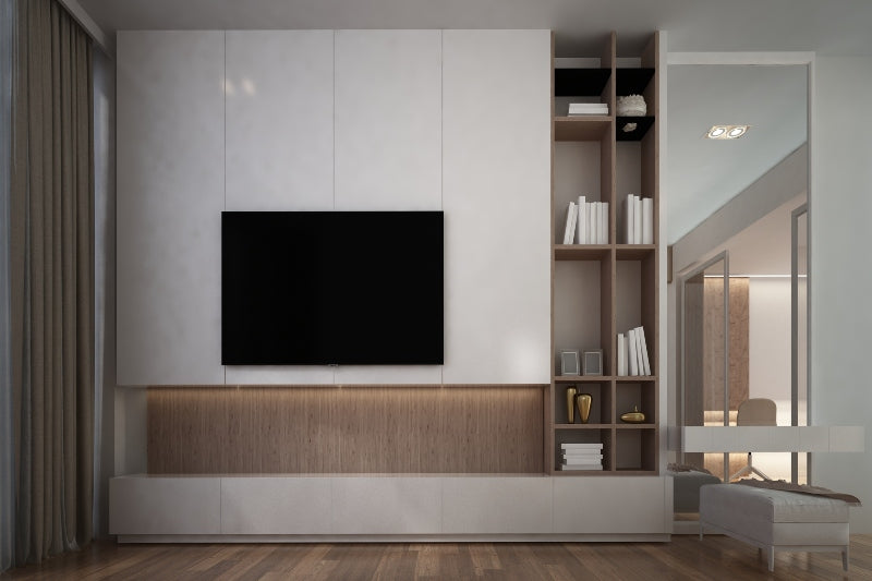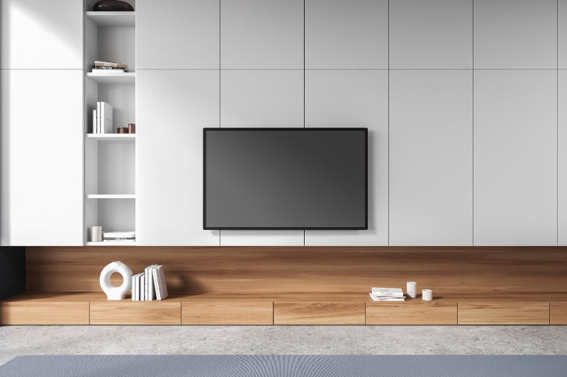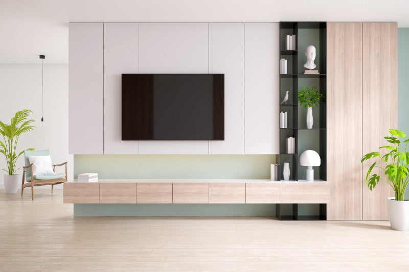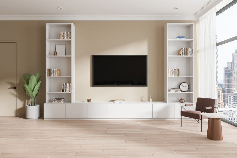 אוסף של נגרות לסלון המשלבת ארונות לבנים חלקים עם עץ טבעי בגוון בהיר.