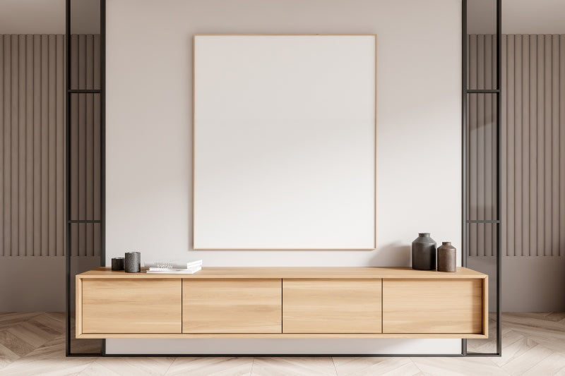שידות נמוכות ברוחב משתנה, מגירות או דלתות בהדפסה רציפה, שילובים עם חיפויי קיר אנכיים או מדפים מינימליים.