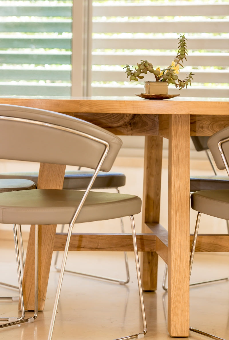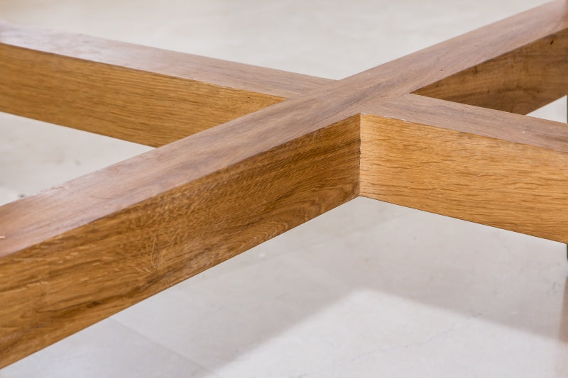 רגלי השולחן נבנו בצורה מוצלבת — פתרון שמספק יציבות מלאה תוך שמירה על קווים נקיים ורחבי־לב, כמו האנשים שסביבו.